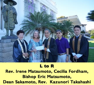 With gratitude our TIAH President Cecilia Fordham, along with 1st VP Rev. Irene Matsumoto, accepted the check from Bishop Eric Matsumoto at the Temple.